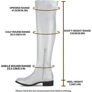 Heel Height: 1 3/8 inches, Shaft Height: 20 7/8 inches; Calf circumferences: 14 inches (The circumference difference of each size cylinder is 1/3 inches)