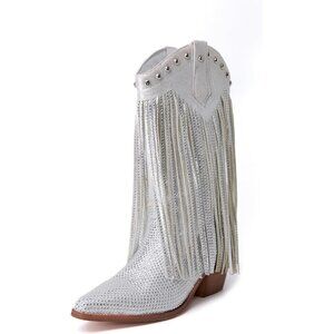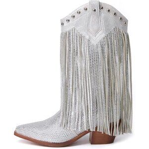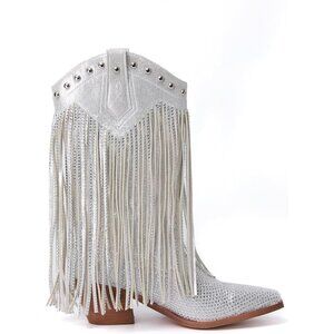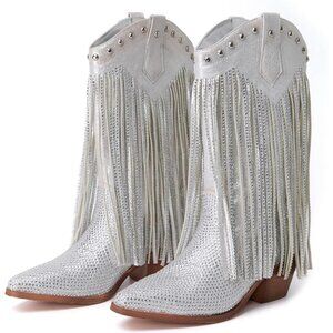 These cowboy - style boots feature a rhinestone - encrusted upper. Long, dangling fringes adorn the shaft, adding a dynamic flair. They have a low - to - medium block heel, offering both stability and a slight height boost.