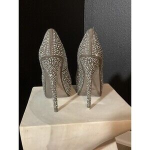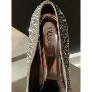 The product is a pair of women's silver rhinestone high heel platform stiletto shoes in size 10 by the brand Mascotte. These glamorous pumps are perfect for parties and events, with a sleek and elegant design that adds a touch of sparkle. The stiletto heel and platform style provide both style and comfort, making them a stylish choice for any special occasion.