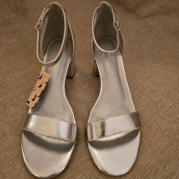 NEW MySoft Women's Silver Sandals with Rounded Toe, Closed Back, Ankle Strap and Stacked Heel, Size 9. Perfect for a special occasion or formal event.
