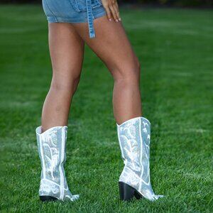 ⚡Women's Silver Sequin Mid Calf Western Cowboy Boots Wide Calf High Fashion