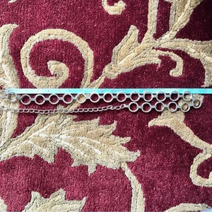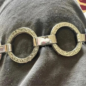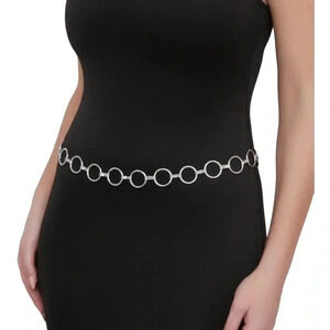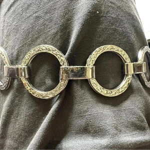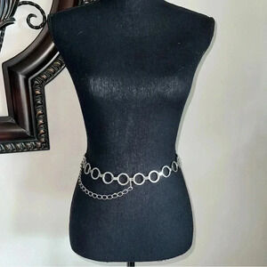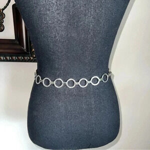 Women’s Silver Tone Chainlink Circle Belt. Great accent piece! Lightweight and in good pre-owned condition! Size: OS fits most ***A few inconspicuous blemishes- Pls see photos***