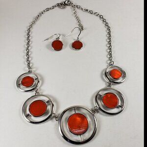 Elevate your style with this elegant jewelry set. The polished silver-tone necklace features a round hoop in a vibrant shade of Blood orange, adding a pop of color to your ensemble. It comes with matching fishhook earrings, which dangle beautifully with a 1.25-inch drop. The necklace measures 18 inches in length and includes a 2.5-inch extender for adjustable wear. This set is the perfect accessory to complement your look, whether it's a casual outing or a special occasion., New Without Tag.