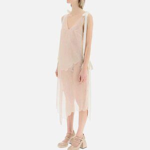 V-Neckline midi-length Simone Rocha Tulle dress. Straight cut, with buttons on the side, satin ribbons at the strap and on the sides,and scalloped edges. Dress is midi-length and loose fit.