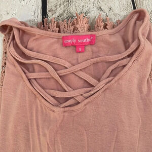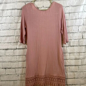Women’s. Simply Southern. Blush pink dress. Lace crochet bottom. Pockets. Preowned condition. No stains/tears. Size small.