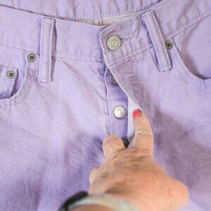 The product is a pair of women's size 28 Levi's 501 denim shorts in a pastel purple color with a button fly and mid-rise design. These shorts feature a cuffed hem and a 5-pocket design, making them perfect for casual or travel occasions in the summer or spring seasons. Made from 100% cotton denim, these shorts have a regular fit and flat front, with a 3-inch inseam and belt loops. The modern and colorful theme of the shorts combines classic denim style with a pop of color, making them a versatile and trendy addition to any wardrobe.