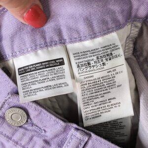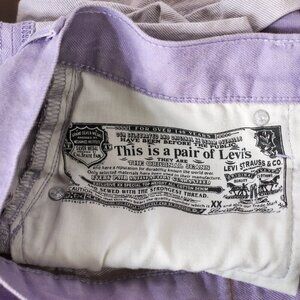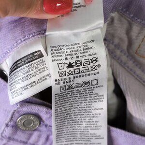 The product is a pair of women's size 28 Levi's 501 denim shorts in a pastel purple color with a button fly and mid-rise design. These shorts feature a cuffed hem and a 5-pocket design, making them perfect for casual or travel occasions in the summer or spring seasons. Made from 100% cotton denim, these shorts have a regular fit and flat front, with a 3-inch inseam and belt loops. The modern and colorful theme of the shorts combines classic denim style with a pop of color, making them a versatile and trendy addition to any wardrobe.