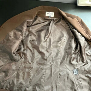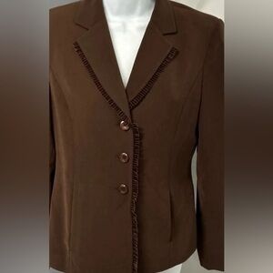 Smart looking brown blazer with ruffle accent down front. Two pocket, three button front.