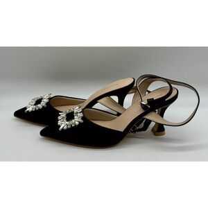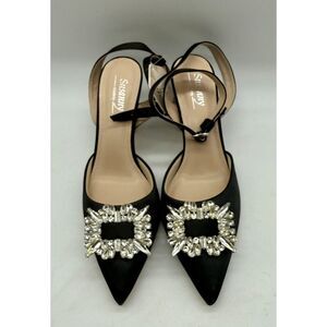 Women's Size 7.5 Black Pointed Toe Rhinestone Slingback Heals Adjustable Strap