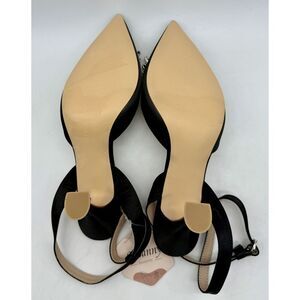 This stylish pair of women's heels in size 7.5 features a black satin upper with a pointed toe and a slingback style. The shoes have a high heel height of 3-3.9 inches and are accented with rhinestones for added glamour. They have an adjustable buckle strap for a secure fit and a synthetic lining and insole for comfort. The outsole is made of synthetic material, making it durable for daily wear. Perfect for adding a touch of elegance to any outfit.