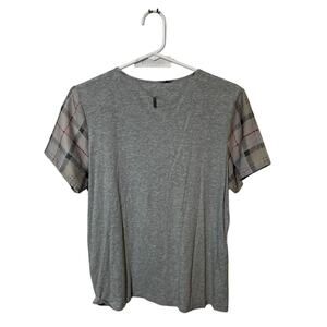 Barbour top, tartan sleeve shirt, gray keyhole blouse, designer t-shirt, sheer sleeve tee, spring fashion, summer lightweight top, British brand shirt, casual chic, classic plaid shirt, gift for mom, layering tee, womens size 8, burberry alternative