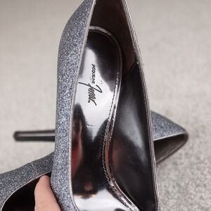 This Women's Size 9 Black Silver Glitter Sparkly Peep Toe Stiletto Platform Heel by Jacqueline Ferrar is a stunning shoe perfect for parties or cocktail events. The ultra high stiletto heel, platform style, and glitter accents give off a sexy and glamorous vibe. Made of synthetic materials with a rubber outsole, these heels are designed to make a statement and catch the light for a sparkly effect. The peep toe shape and open toe design add a touch of allure, making them a desirable choice for any fashion-forward woman looking to make an entrance.