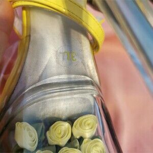 Extra details: There are stacks of yellow roses in the front and in the heel. There is a yellow gradient up the heel. The straps have bling. MA*RS sells similar heels but in pink and black. They were purchased after seeing similar looking heels in the gyaru magazine koakuma ageha.