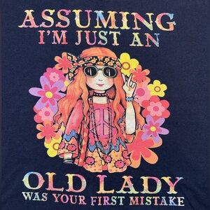 This navy-colored shirt features the playful saying, "Assuming I'm just a grandma was your first mistake," alongside a charming illustration of a hippie grandma. It’s the perfect blend of humor and style—great for casual outings or lounging at home!
