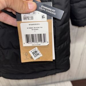 The product is a women's size L The North Face Mossbud reversible jacket in a stylish black color. Made of polyester, this puffer jacket features a reversible design, allowing for versatile styling options. Perfect for outdoor activities or everyday wear, this jacket combines practical functionality with a trendy design from a reputable brand like The North Face.
