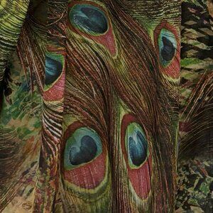 Beautiful fall colors are put into this lovely Boho style asymmetrical sheer blouse. Red, green, gold, blue orange all together on a background of black. The pattern is a floral design down the front with 4 decorative buttons on the front. The sleeves, back and side have the design of peacock feathers. The back is about 3" longer than the front. The blouse length is 28", the sleeve measures 20" and pit-pit measurement is 20".Theh sleeves end in an elastic band.