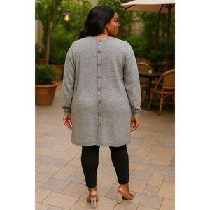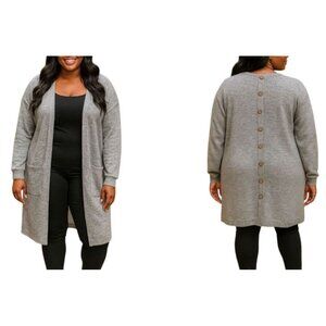 button-back cardigan, heather grey sweater, longline cardigan, plus size chic, front pocket sweater, relaxed open front, plus size fashion, chic fall sweater, women's casual cardigan, cozy layering sweater, back button detail sweater, classic women's style