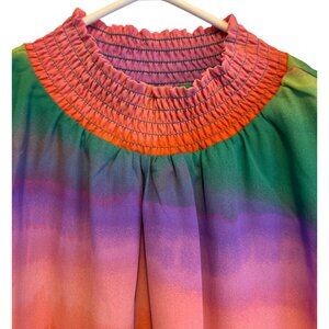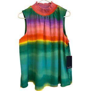 Nicole Miller top, rainbow striped, sleeveless blouse, women's top, smocked neck, colorful shirt, casual wear, polyester blouse, vibrant colors, designer top, summer fashion, Nicole Miller apparel, striped tank, multicolor top