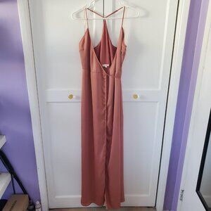 Satin-type fabric wrap dress by Cotton Candy LA. Its a pink/mauve color. Lined with a half slip as pictured. Comfortable. Size medium. excellent condition.