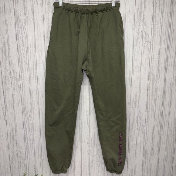 The product is a pair of women's size small Fred Segal X Camp Beverly Hills sweatpants in green. These stylish pants are designed for comfort and casual wear, featuring a relaxed fit that is perfect for lounging or running errands. The collaboration between Fred Segal and Camp Beverly Hills ensures high-quality construction and a unique design that sets these sweatpants apart from other regular-fit pants. Perfect for the modern woman looking for a trendy and comfortable addition to her wardrobe.