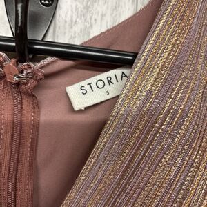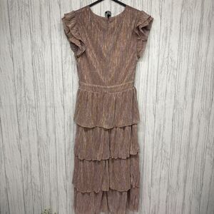 This is a women's size small Storia dress in a shimmering pink color with gold accents. The dress features a stylish ruffle design and falls at a midi length. The dress is perfect for those looking to add a touch of glam with a metal-themed look. The dress is in excellent used condition.