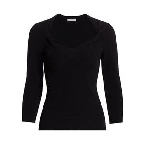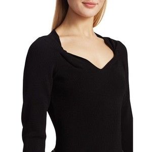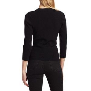Womens Size S/M Milly Twist Front Sweater Black EUC. No size tag see measurements very stretchy Twisted trim framed this elegant V-neck sweater. V-neck with twist detail Three-quarter sleeves Ribbed Viscose/spandex/polyester Dry clean Imported Chest 15 Length 22