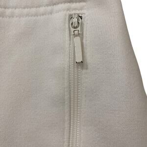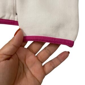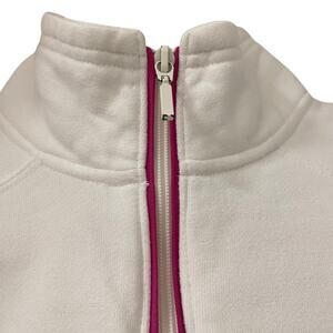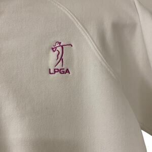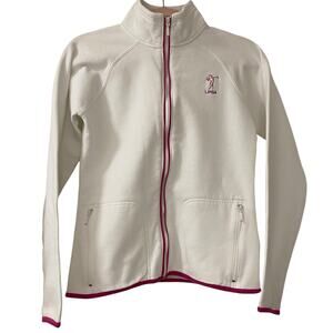 Very soft, white sweater with pink accents on the sleeves, by the zipper, and bottom hem. It also has a pink logo of LPGA on the left side of the chest.