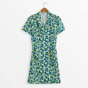 Knee-length button front shift dress. Flattering wide lapel and v-neckline. Playfully-pleated short puffed sleeves. Princess seam darts. Two front patch pockets. Center back seam.