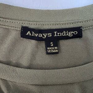This Women’s Size Small “Always Indigo” is in great condition. I think it is an Olive color. This blouse is made of 95% polyester and 5% spandex. This blouse has some stretch. Machine washable.