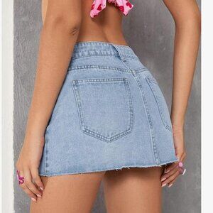 Mini denim skirt for women, single button, zipper, mini length, raw hem, 2 side pockets