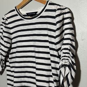 Women's Size XS Veronica Beard Waldorf Stripe Ruched-Sleeve Tee White Multi 1/2 Sleeve Casual Lighweight