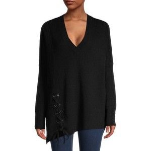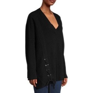 Fashionable wool-blend sweater with side slits and lace-up detail on the hem. V-neck Dropped shoulders Long sleeves Asymmetrical hem Wool/polyamide/viscose/cashmere Hand wash Imported Pit to pit 30 Length 29 Minor piling throughout