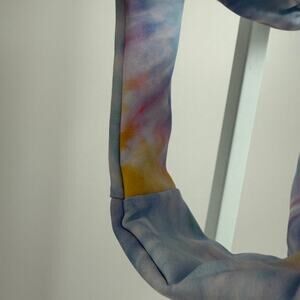 This is a pre-owned 'SKATE' brand bikini bottom, size medium. It features a tie-dye pattern with pastel colors including blue, purple, and yellow. The material is 79% recycled polyester and 21% spandex. The garment has a thin elastic waistband and adjustable side ties. There are no visible stains, tears, or other significant imperfections. The item is designed in Venice and made in LA.