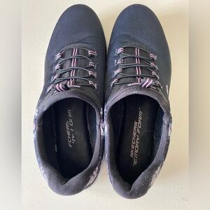 Women’s Skechers Black and Pink Floral Accent Slip On Sneakers