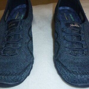 Skechers - Womens, Movin Easy, Navy Blue- relaxed fit, breathe easy, slip-on bungee laced sporty casual comfort sneakers. Soft knit mesh fabric upper. Open weave panels at toes and sides. Texture accent and side curved stripes.