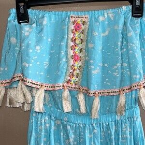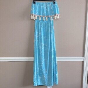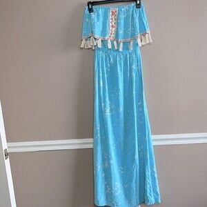 Women’s Skemo light blue bleach spotted tasseled sleeveless maxi dress beach
