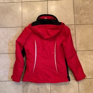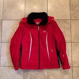 This ski jacket has multiple zippered pockets, two inside pockets, a detachable hood, and black fleece collar.