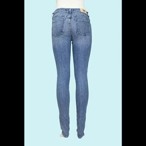 A soft blue tone skinny jeans with zipper fly button closure, featuring five pocket style stretchy jeans with low rise.