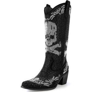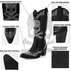 ⚡Women’s Skull Black Rhinestone Cowboy Boots Mid Calf Pointed Toe Block Heel