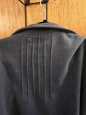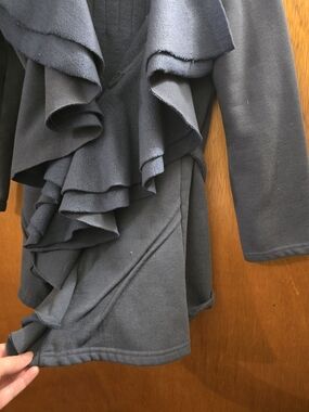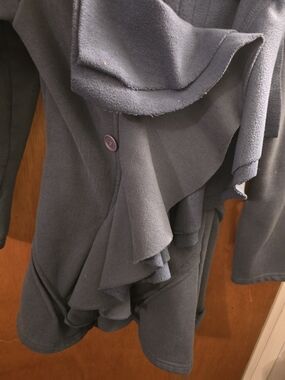 Soft slate blue tailored fleece jacket with dramatic ruffle front for a feminine silhouette. Fleece and warm, comfortable for layering over tops and dresses. Open front design with hook and eye closure for easy wear and versatile styling. Slate Blue color adds timeless appeal.