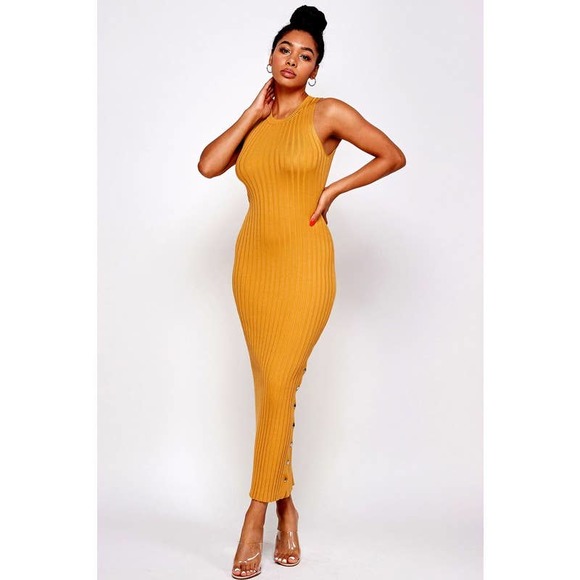 Casual classic knit Rib sweater KNIT dress - Maxi knit dress with Snap button one side Sleeveless - Body con maxi knit sweater dress - She is Wearing a Small - 5' 7'' 37-27-37. Egg Yolk color