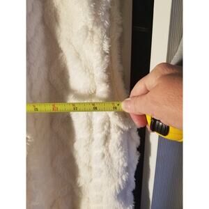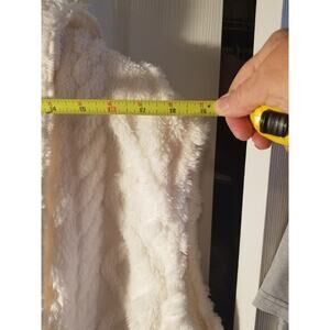 32 in. Long, Chest and shoulder to shoulder 18 in. Wide. This women's sleeveless cardigan vest is a stylish addition to any wardrobe. The fuzzy ivory color and solid pattern make it perfect for a boho-inspired look. The vest is one size fits all and has a regular size type.