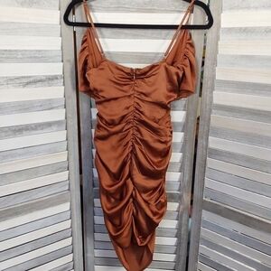 Satin bodycon dress from Wild Fable™ in a solid hue with ruched seams. Made of 100% recycled polyester in a sleeveless, mini-length silhouette. Designed with a V-neck crisscross, wrap-like front and cut-out detail. Features slender shoulder straps with buckles for a custom fit, as well as a back hook closure with concealed half-length zipper. Ideal for homecoming, weddings and other formal occasions.