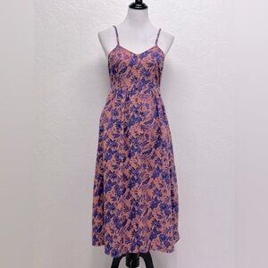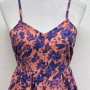 A-line dress with all over floral print. Made from cool, breathable cotton fabric front button-down detail and side pockets Adjustable spaghetti straps. Back tie-closure with keyhole detailing.