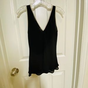 Double layered (attached) beautiful sheer blouse with a deep V-neck on the front & back with flutter bottom in black and cream trim detail. Lightweight, perfect for summer! Can be dressed up or down. Like new, great condition, no flaws. Never worn, but was washed. Please see photos for approximate measurements. 100% Polyester.