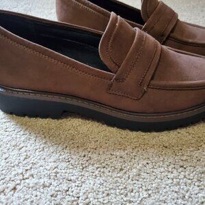Women's Slip on Loafers by Indigo Road; Dark Brown Suede Look, Black 'waffle' sole with a slight heel. Perfect for adding a little height, great with jeans and dress slacks.