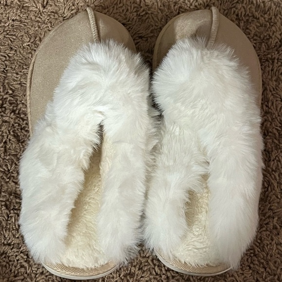 Step into comfort with these luxurious women's slippers featuring a soft faux fur lining. Perfect for relaxing at home, these slippers offer warmth and style. So soft and cozy! Fits size 8/9.