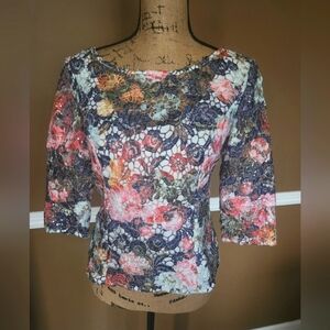 Elegant floral lace top with a blend of vibrant colors. Perfect for any event or just classy beach surfing. Excellent preowned condition with no missing sequins or flaws. White inner lining. Zips up in back. Size Small.