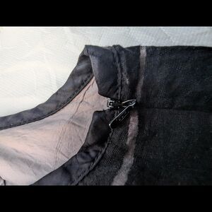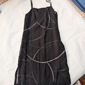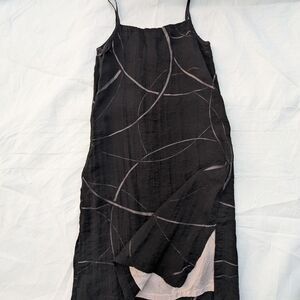 Black and grey slip dress with a side zipper and side slits. The dress is black with a geometric design that is sheer where the grey lining shows through. Super cute and in excellent condition. Bought in HK in early 2000s Fits like a XS / S #gothicvibes #y2k #2000s #vintage Brand=U2