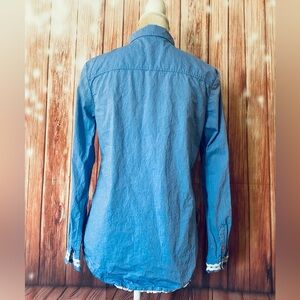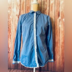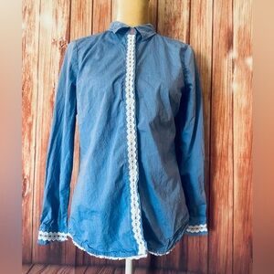 Women’s Small Blouse Hannah Button Down Blue Lace Trim Long Sleeves 100% Cotton